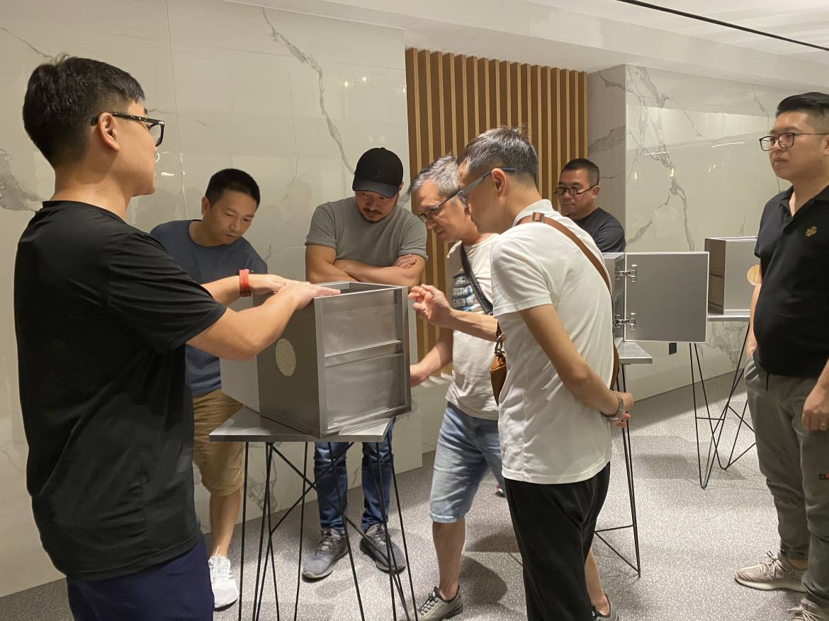 在接下來的活動中,設計師朋友們跟隨著庫靈圖展廳參觀的動線,逐步了解了各類不銹鋼廚柜、陽臺柜等產品和工藝細節(jié)。R角一體壓模成型、蜂窩鋁+環(huán)保發(fā)泡復合填充等專屬于庫靈圖的獨家工藝技術,以及各類人性化設計細節(jié)和時尚外觀,讓設計師們倍感興趣,好評不斷。